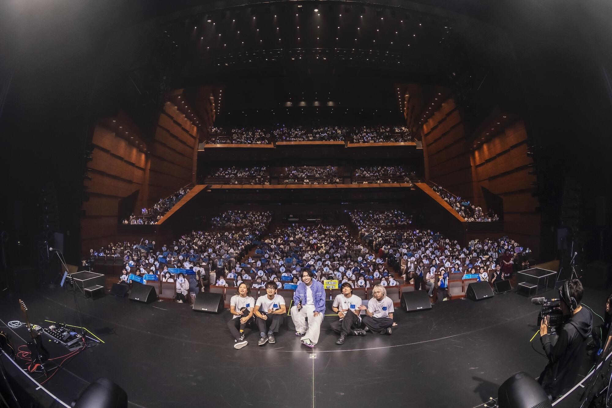 客席をバックにして笑顔で記念撮影、バンドメンバーとマイクオフで深々とお辞儀をした千葉翔也は