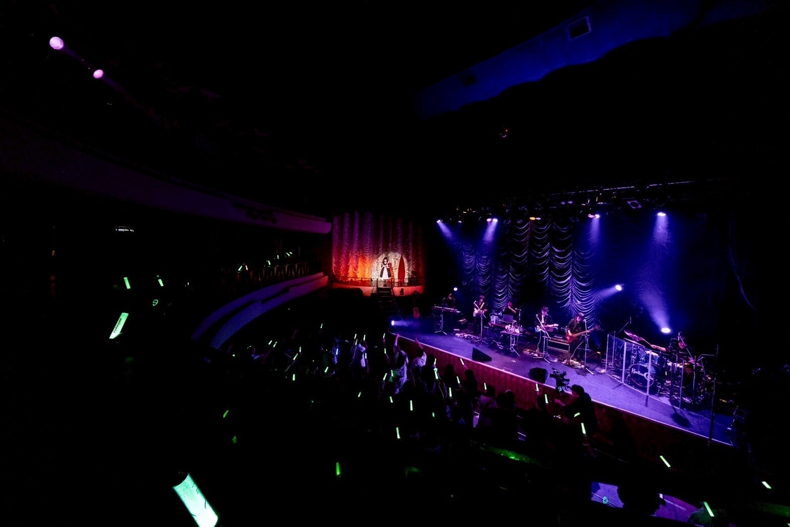 当日、好天に恵まれたGWの下町に、幅広い年齢層・性別のるな充(春奈るなファンの呼称)が集結。開場となり白地に白いロゴという、モデルも務める春奈るなならではのお洒落なライブTシャツに身を包んだるな充が整然とエレベーターで入場。レトロモダンな場内にはFC「るな充STATION」会員向けの特典QRコードが出迎える。大正ロマンのオペラハウスを模した東京キネマ倶楽部内はメインステージの左上にサブステージが設置され、階段で結ばれた二層式。上方から大型スクリーンが垂れたステージ上にはバンド機材が所狭しと据えられ、月をあしらったオリジナルロゴ入りドラムヘッドが目を引く。