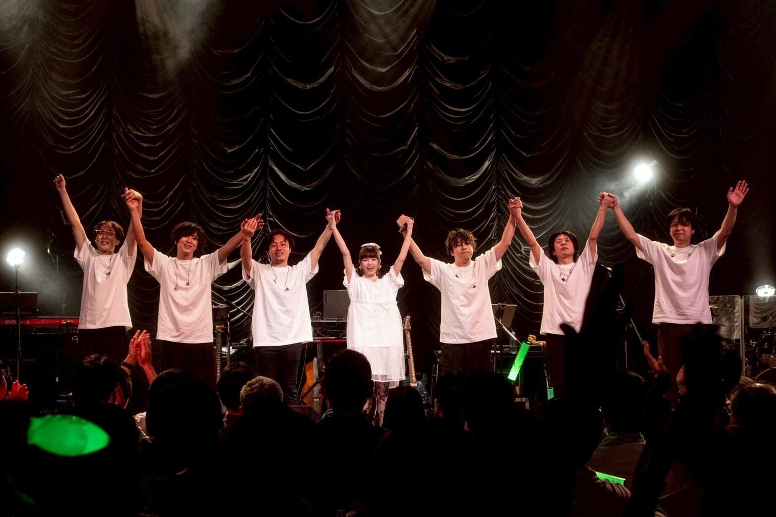 と謝意を示す。ギターL&バンマス・Saku、ギターR・森空青、ベース・okamu.、キーボード・桑原康輔、ドラム・田辺貴広、マニピュレーター・タルタノリキのバンドメンバーとステージ前方に並び、マイクオフで