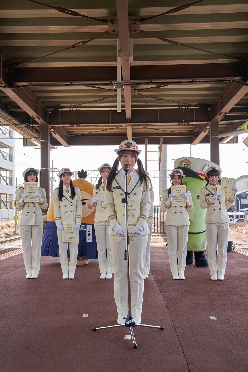当日は、東京駅から天童駅まで、山形新幹線つばさ号の3車両を貸し切り、ファン参加型のツアーを実施。天童駅のホームには約200名のファンが集まり、相川奈央、麻丘真央、天城サリー、河瀬詩、椎名桜月、月城咲舞、望月りのの7名がホームで出迎えると、そのままJR天童駅一日駅長就任式が執り行われた。JR東日本 山形統括センター所長・佐々木高敏氏より委嘱状が授与され、メンバーはJR東日本の制服姿で一日駅長としての役割を担った。