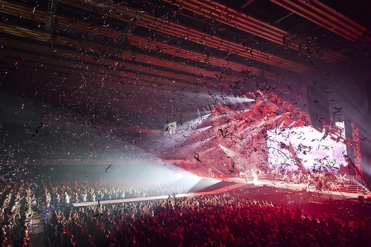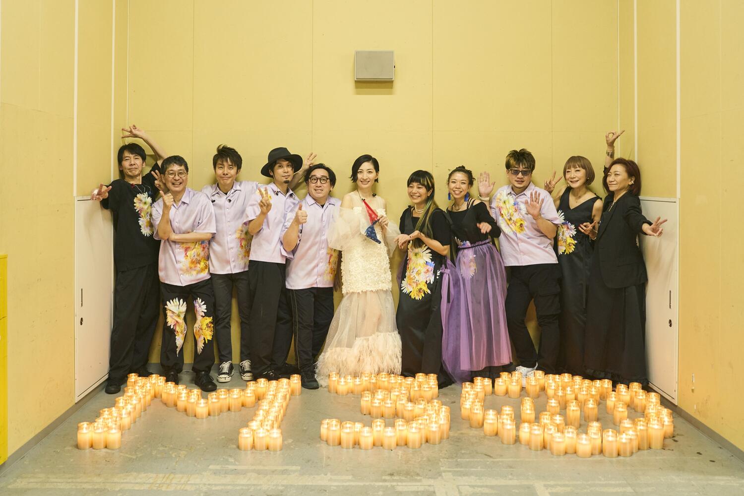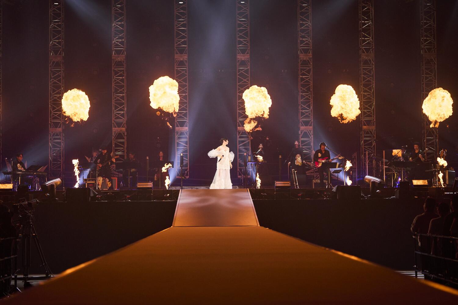 最初のMCでは「こんなにいっぱいの人の前で歌うとか、どうかしてる~!」と笑顔で率直な言葉を口にし、集まった観客みんなを笑顔にした。そして「ずっと前から私のことを応援してくださっている方も、今日初めて私のことを知ってくれた人も置いてけぼりにしない優しいライブにしたいと思います!」と宣誓。オープニングで着用していたアイボリーのジャケットからブルー系の美しいドレスに衣装チェンジすると、パープルの薄いベールに包まれたような照明の中で「紅茶」をしっとりと、でも清涼感たっぷりに歌い上げた。バンドのカオティックなセッションも見事だったのは「birds」で、狂おしくヒリヒリとした感情を伸びやかに歌い上げる姿が圧巻だった。有明アリーナの大きな会場で1曲ごとに異なるドラマを生み出していく様は、やはり30年というキャリアの成せる技。「声出してくれるかな?」と会場にマイクを向けた「Drops」ではみんなが心の叫びを歌に乗せ、この日だけの音楽が完成した。