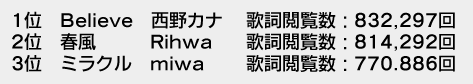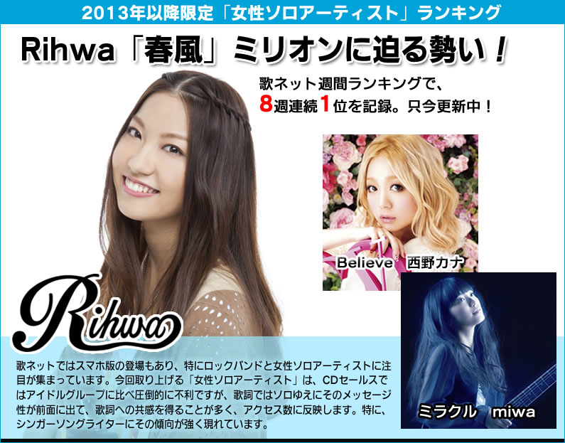 歌ネット歴代ランキングで、現在ミリオン(100万回)を超えている女性アーティストの楽曲は、 miwa「ヒカリヘ」、木村カエラ「Butterfly」、西野カナ「Best Friend」の3曲で、中でもmiwa の「ヒカリヘ」は最短記録でミリオンを達成した記録を持つ人気曲だ。このミリオンの射程距離内にあるのがRihwaの「春風」であり、1位の「Believe」と比べると、発売からすでに10ヶ月が過ぎている曲とは毎日積み重なるアクセス数の勢いが違うのだ。(歌ネット歴代ランキング参照