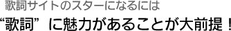 このランキング全体をみると、西野カナと並んで、「ヒカリへ」をミリオンに持つmiwaが、ともに5曲をランクインさせている。特に昨年のmiwaの躍進は素晴らしく、今後発売する全ての楽曲が、ランキング上位に入ってくるだろう。続いて、一昨年ブレイクした、きゃりーぱみゅぱみゅが4曲。いまだカリスマ的人気の安室奈美恵が3曲ランクインした。安室奈美恵はデビューからすでに20年以上経っておりアイドルでは考えられない現象で、存在そのものに歌詞の世界を超えた魅力があるのだろう。その他には、阿部真央、家入レオがそろって2曲ランクイン。彼女たちのメッセージが浸透し、ユーザーから支持された結果が反映している期待のアーティストだ。また、すでに歌詞への共感を得ている、加藤ミリヤやAI、aikoなど安定した人気のベテラン勢も健在で、歌詞に魅力のあるアーティストは、これからも歌詞サイトのスターであり、ヒロインであり続けることだろう。
