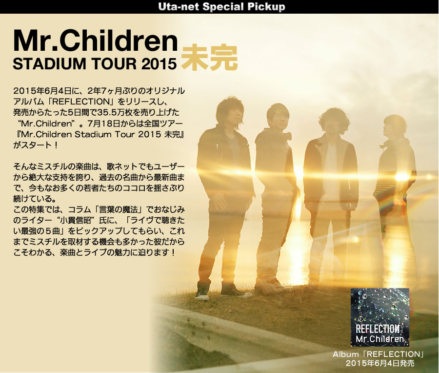 7月18日からスタートする『Mr.Children Stadium Tour 2015 未完』。アルバムのリリースをツアーの最終日とした『REFLECTION』のツアーを経て、ここからは正真正銘、ニュー・アルバムを引っ提げてのものとなる。当然、アルバムのなかの新しい作品が披露されることだろう。その一方で、季節は夏。場所がドームやスタジアムということもあり、お祭り的な要素も加わった内容になるのかもしれない。通常ならセットリストを組む際に、そのツアーごとのコンセプトというのがあるが、お祭りとなれば別だ。縁日に出掛けていって綿菓子や金魚掬いがなかったら寂しいように、みんなが聴きたい定番の曲も、きっと用意されている………、可能性は高い。