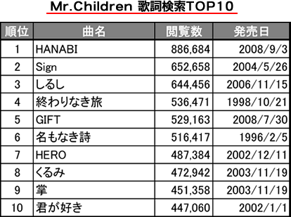 Mr.Childrenの楽曲のなかで、歌ネットにおける歴代アクセス数第1位が「HANABI」なのだという。数字を見ると、2位の「Sign」をけっこう引き離している。この歌は、なぜこれほど注目を集めるのだろう。いい歌だから。もちろん大きな理由だろう。歌詞を検索するということの必要性でいうなら、比較的言葉が詰め込まれているタイプの曲であることも関係するのだろう。