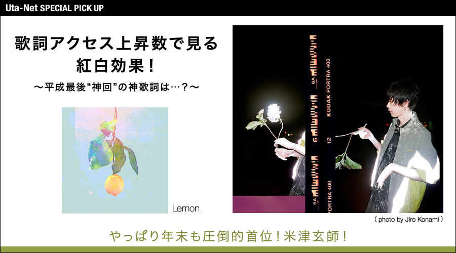 ただし、歌詞アクセス数に表れた紅白の反響に注目してみると、必ずしも視聴率と“歌詞の注目度”が比例しているわけではないことがわかります。【紅白効果 楽曲別アクセスTOP20】には、2018年に新たに誕生した名曲や新世代アーティストの楽曲がズラリとランクイン。この特集では、そんな“紅白効果”に注目してみました。