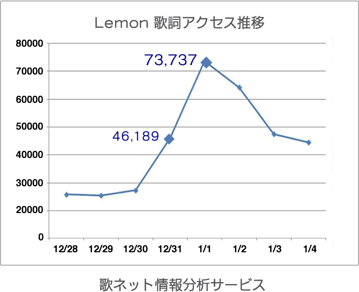 最も歌詞アクセス数が上昇したのは、米津玄師の「Lemon」です。昨年の年間ランキング1位に輝き、3月リリースの楽曲にも関わらず、12月に入ってもデイリー1位に登場しておりました。そして12月26日、紅白出場が発表されるとアクセスが急上昇し、前日の約6倍のアクセス数を記録。さらに大晦日には約4万6千回。元旦にはなんと約7万3千回のアクセス数を獲得…!