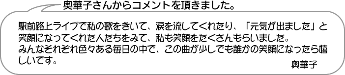 お送りいただいたコメントの中から、奥華子本人が選んだコトバは、ノベルティとして、奥華子本人による朗読CD化(非売品)される予定です。