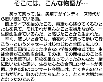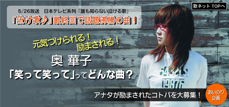 奥華子さん「笑って笑って」の歌詞のような、「アナタが励まされたコトバ」「元気づけられたコトバ」を教えてください!歌詞に限りません!親に言われたコトバ、先生に言われたコトバ、本に書いてあったコトバ…などなど、エピソードも合わせて送ってください!