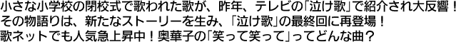 小さな町の小さな小学校の閉校式からの小さな波紋はジワジワと広がりを見せ、2008年、日本テレビ系列「誰も知らない泣ける歌」で紹介され、大きな反響を呼んだ。その物語りは、新たなストーリーを生み、5月26日放送の「誰も知らない泣ける歌」最終回での再登場となった。日本全国から、「この曲のCDが欲しい!」「この曲を歌いたい!」「この曲の楽譜が欲しい!」と言う問い合わせが殺到。小さな町の小さな小学校から始まったストーリーは、多くのひとたちの心を捕らえ始めている。