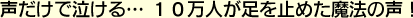 聴いた瞬間から心に染み入るメロディと歌詞、“声だけで泣ける”と称されるその歌声は、老若男女問わず、幅広い世代からの支持を集め、聴く人の心を捕らえている。