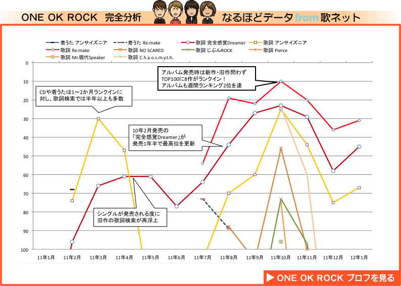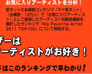 | さらに驚くべきは、ヒットを継続するアーティスト群の中に、ONE OK ROCKが堂々7位にランクインしていることだ。昨年、アルバムが初めて10万枚を突破したとはいえ、アーティスト・セールスはまだ66位。ちなみに音楽配信やカラオケでも年間TOP50圏外で、やはり彼らもまた歌詞が大いに注目されていることが分かる。「My Favorite Artist 2011」には、彼らの他にも、41位にSEKAI NO OWARI、50位にゴールデンボンバー、そして57位にback numberと、昨年ステップアップしたバンドが見つかり、これもこの「お気に入りアーティスト」ランキングに突出した傾向だ。当然、LIVEの動員状況やファンの満足度もバンドの実力を示す重要な指標だが、歌詞検索はバンドの人気度がより端的に数字として現れやすいと言えるだろう。 |