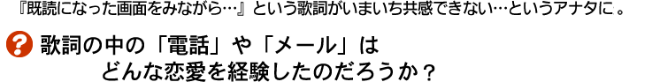 「既読になった画面をみながら…」などという歌詞がつづられているこの曲、人気無料通話アプリLINEに備わっている機能で、相手にメッセージを送ったにもかかわらず反応がもらえないという切なくて悲しい様子を歌っている。また、敏感に流行文化を歌詞に取り入れる「西野カナ」より先取りしている点で、ツイッターなどで大きな話題となった。「共感」→「理解」、「あるある」→「わかるよその気持ち!」など、ヒット曲は感動ソング(昭和世代)から共感ソング(平成世代)へと確実に移行している!