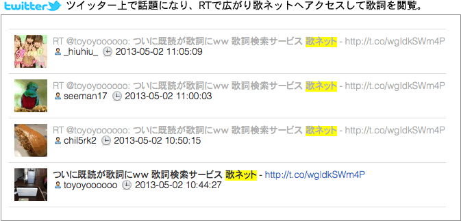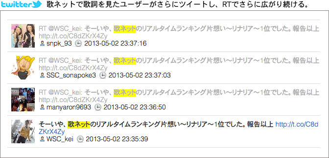 歌ネットでも人気の彼らだが、いち早く「既読」(※注1)をテーマにした曲を発売することで、注目を浴びソーシャルメディアで一気に広がり、その歌詞を確認するために歌詞サイトへ訪れ、歌詞を見たユーザーがツイートし、RTでさらに広がり、この大記録になったとスタッフは分析している。