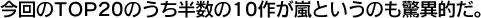 2位は、嵐のほぼ1年前のシングルがランクイン。デビュー曲「A・RA・SHI」から、この時点での最新シングル「マイガール」まで今回のTOP20のうち半数の10作が嵐というのも驚異的だ。特に、この月は、「日本ゴールドディスク大賞」にて"史上初の10冠"(最多売上アーティスト、最多売上シングル、ヒット・シングル4作、最多売上&ヒット・アルバム、ヒットDVD2作)と大きく報道されたことも拍車をかけた。このことから、単なるタレントとしての人気ではないことも納得。