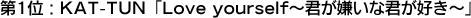 1位は、KAT-TUNの最新シングル曲。彼らのシングルは、高セールスの割に歌詞検索数では上位にならないこともままあるが、本作では着うたも歌詞検索でも上位で、従来の彼らと比べ発売種類が多い訳でもないのにCDセールスも伸びている。このことからも、楽曲のチカラで支持されていると言えよう。