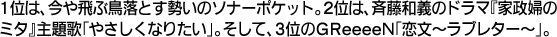 3位のGReeeeNは「ラブ」も「愛」も「好き」も、タイトルに「恋」も含まれていて、見た目上は雑然(笑)だが、後半で「愛」が沢山出てくることで楽曲が締まって聞こえる。やっぱり、最後に「愛は勝つ」のだ。(それにしても、7位の「キセキ」は、これで4年連続上位入り!こんな“キセキ”が起きるのも愛だからか。)