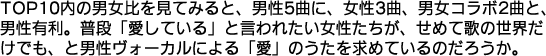 TOP10内の男女比を見てみると、男性5曲に、女性3曲、男女コラボ2曲と、男性有利。筆者も含め、「愛している」なんて普段言えないからこそ、ここぞとばかり男性ヴォーカルによる「愛」のうたが支持を集めるのだろうか。あるいは、普段「愛している」と言われたい女性たちが、せめて歌の世界だけでも、と男性ヴォーカルによる「愛」のうたを求めているのだろうか。謎は深まるばかりだが、いずれにせよ、このように歌詞の内容で人気が変わると推察できるのも「愛」ゆえの一途なチカラからであろう。