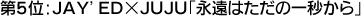 2年前にダウンロード・シングルがミリオンヒットとなった(ちなみに、2011年単独で、フル音源のダウンロードでミリオンヒットは1曲もなし。。。)「明日がくるなら」から2年、同じコンビでのコラボ・シングル。冬にふさわしくまったりとしたバラードで、二人のハモリも温かく、まさに“愛”にふさわしい仕上がり。ちなみに、JAY’EDは先月2ndアルバム『Your Voice』を発表。本シングルのほか、ニッセンCM曲「Shine」、ドラマ『美咲ナンバーワン』主題歌の「何かひとつ」、JAY’ED×若旦那名義の「Toy box」など話題てんこ盛りだが、それ以上にハードなダンス・チューンから、ベタなバラードまでハマる歌声に成長したことにあらためて感心した。話題性も実力も申し分ないのに、売り上げが前アルバムから急落しているのは、何らかの形で買わずに済ませている人が多いからだろうか。コラボ相手のJUJUが、姐御肌で絶大な同性支持を得て、30万枚ヒットをキープしているのとは対照的。やはり、今のご時勢、アイドル以外でもキャラクターまで浸透させなければ、ヒットの継続が難しいという事なのかも。ともあれ、作品の完成度の高さに罪はなし。