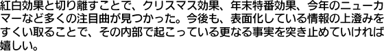 以上のように、紅白効果と切り離すことで、クリスマス効果、年末特番効果、今年のニューカマーなど多くの注目曲が見つかった。今後も、表面化している情報の上澄みをすくい取ることで、その内部で起こっている更なる事実を突き止めていければ嬉しい。その為にも、今年もご支援よろしくお願いいたします♪