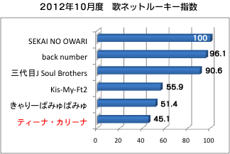 それで長らく冬の時代だった女性ソロを分析しようとしたのだが、miwaの「ヒカリへ」が自身最大のヒットで歌詞検索でも月間ダントツ1位、西野カナの4thアルバムが好調、シェネルの「ビリーヴ」の今年最大級のロングヒット、更に後述のティーナ・カリーナのブレイクなど、女性ソロは月間TOP10中6曲を占めるほど、今花盛りとなっていて、これも十分目立っている。そこで、大所帯でもソロでもない2人組から5人組までのアーティストに限定することで、ブームに隠れたムーブメントをしっかりと見出そうというのが今回の主旨だ。