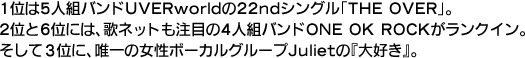 ランキングを見ると、1位は5人組バンドUVERworldの22ndシングル「THE OVER」。TBS系ドラマ『黒の女教師』中の恋人同士が熱く語るシーンで、フルサイズで何度も流れた主題歌。ガンダム・シリーズなどアニメ・タイアップのヒットが目立つ彼らだが、実はドラマ・タイアップ・ヒットも多い。激しさも恋しさもMAXに聞こえるTAKUYA∞のボーカル力も大きいことだろう。