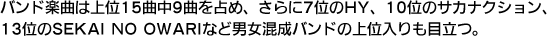 他にも、バンド楽曲は上位15曲中9曲を占め、さらに7位のHY、10位のサカナクション、13位のSEKAI NO OWARIなど男女混成バンドの上位入りも目立つ。これは、世間的なバンドのシェアから見ても、かなり多い。男女混成の方が、恋愛などより感情移入しやすい聞き方ができることが多々あるからだろうか。