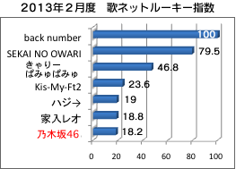 今月はルーキー部門7位の乃木坂46に注目。言わずと知れた、AKB48の公式ライバルで、2012年2月22日にデビューし、CDでは常に20万枚以上のヒットを放ってきた彼女たち。とはいえ、その売上の2/3以上が限定通販サイトでの個別握手券付きCDによるもので、閉鎖的なヒットだった。しかし、最新作「制服のマネキン」は、彼女たちとしてはかなり激しいダンスと笑顔を見せないパフォーマンス、そして語気の強い歌詞と意外性を突いて一気に歌詞人気が急上昇、またダウンロードでも5週間連続TOP20入りするセミロングヒットとなり、ここへきて楽曲そのものにも注目が集まっている。