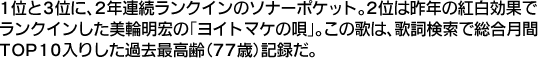 以下、その3区分で見ていこう。まず赤色のトップは、2位の美輪明宏「ヨイトマケの唄」。この1曲の御蔭なのか「今年の紅白はつまらなかった」という人が激減したように思う。心から感動した人が多数、また感動しなくてもそれを理解できない方が愚かだと黙らせてしまうほどの説得力があったのだろう。その歌詞を確認しようとした人が続出し、この結果に。勿論、歌詞検索で総合月間TOP10入りしたのも過去最高齢(77歳)だ。また、日本レコード大賞で優秀アルバム賞を受賞したSEKAI NO OWARIが6位、初のベスト盤リリースタイミングで『ミュージックステーション』に出演したMONGOL800が7位と、こちらも美輪明宏同様に、"珍しい人が珍しい番組に出た"効果がしっかり出ている。