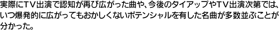 このように、旧作のロングヒットをみると、実際にTV出演で認知が再び広がった曲や、今後のタイアップやTV出演次第では、いつ爆発的に広がってもおかしくないポテンシャルを有した名曲が多数並ぶことが分かった。一つ、気になるのは、上位16曲を見ても、女性歌唱はシェネルの英語曲とHYの仲宗根による「366日」だけで、あとはすべて男性歌唱曲ということだ。女性歌唱は、アイドル達の熾烈な争いのために、楽曲が長く聞かれない状態なのだろうか。目先のイベント参加券で売上を稼ぐだけじゃなく、このランキングに入るような女性シンガーのロングヒットを作ることも音楽業界の大命題と言えそうだ。