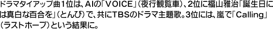 テーマ順位を見ると、1位のAI、2位の福山雅治は共にTBSのドラマ主題歌。前者は夏木マリの怪演など衝撃的なシーンが多いことが、後者は古き良き感動作として、共にネット上でも大いに盛り上がり、歌詞人気もダウンロードチャートも絶好調だった。11位のドラマ『純と愛』の主題歌も、ネット上では「主人公が朝からギャンギャンうるさい」とネガティブな口コミも活発だったが、♪信じていれば、きっと伝わる〜という主題歌は配信開始からずっと上位で推移しており、実はドラマの支持者も多かったことがうかがえる。