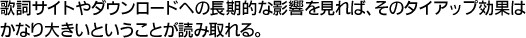 (それよりもイベントに参加できるか、グッズがもらえるかの方が遥かに大きな購入要因となるようになった)昨今だが、歌詞サイトやダウンロードへの長期的な影響を見れば、そのタイアップ効果はかなり大きいということが読み取れる。本当のヒット曲は、1週間などでは決められないはずだ。