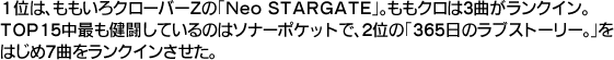 さて、今回の人気曲TOP15を見てみると、1位はももいろクローバーZとなった。しかも、この「Neo STARGATE」は、最新アルバムのリード曲であって、シングルではない。アイドルでアルバム曲が高く評価されるのは非常に珍しく、この結果は、これまで1曲1曲話題性の高い楽曲を制作し、宣伝面も含め常に話題を振りまいてきた彼女たちやスタッフの努力の賜物と言えよう。