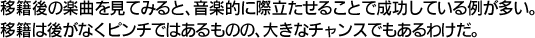 以上のように、移籍後の楽曲を見てみると、音楽的に際立たせることで成功している例が多い。これは、手っ取り早くイベント参加券をくっつけて一人に大量に買わせることよりも、音楽を広めようと努力するという点で、むしろ健全な行為とも言えるだろう。つまり、移籍は後がなくピンチではあるものの、大きなチャンスでもあるわけだ。