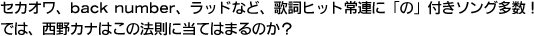 以上のように、“「の」の法則”は、J-POPにもある程度通用していることが分かった。今後、西野カナのシングル曲が、「の」を使った長文になった時、音楽性も大きく変わるだろうし、きっと彼女の中で何か大きな変化があった時だと妄想してみるのもJ-POPの楽しみ方の一つだろう。