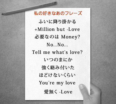 KAT-TUNのデビューアルバム『Best of KAT-TUN』の収録曲です。バラードだったので、今からデビューするかっこいいメンバーにどんな歌詞を書くか、色々試行錯誤した記憶があります。いつかきっと出会える大切な人、あなたは一人じゃない、励ましになるような歌詞になれたらと思い、共作詞の白井裕紀と書きました。デビューライブの東京ドームを見に行った際に、ファンの方が一緒に歌っていたり涙しているのを見て感動しました。とても素敵なバラードで、お気に入りのひとつです。 -