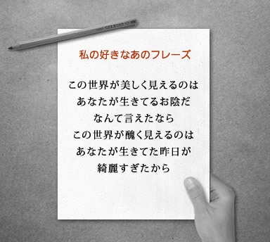 このサビのフレーズと歌詞を自身の作品として世に出す為に、今まで音楽を作ってきたんだなと当時思いました。今でも思っています。自分がこの世から居なくなったとしても、ずっと誰かの中で残って欲しい作品です。